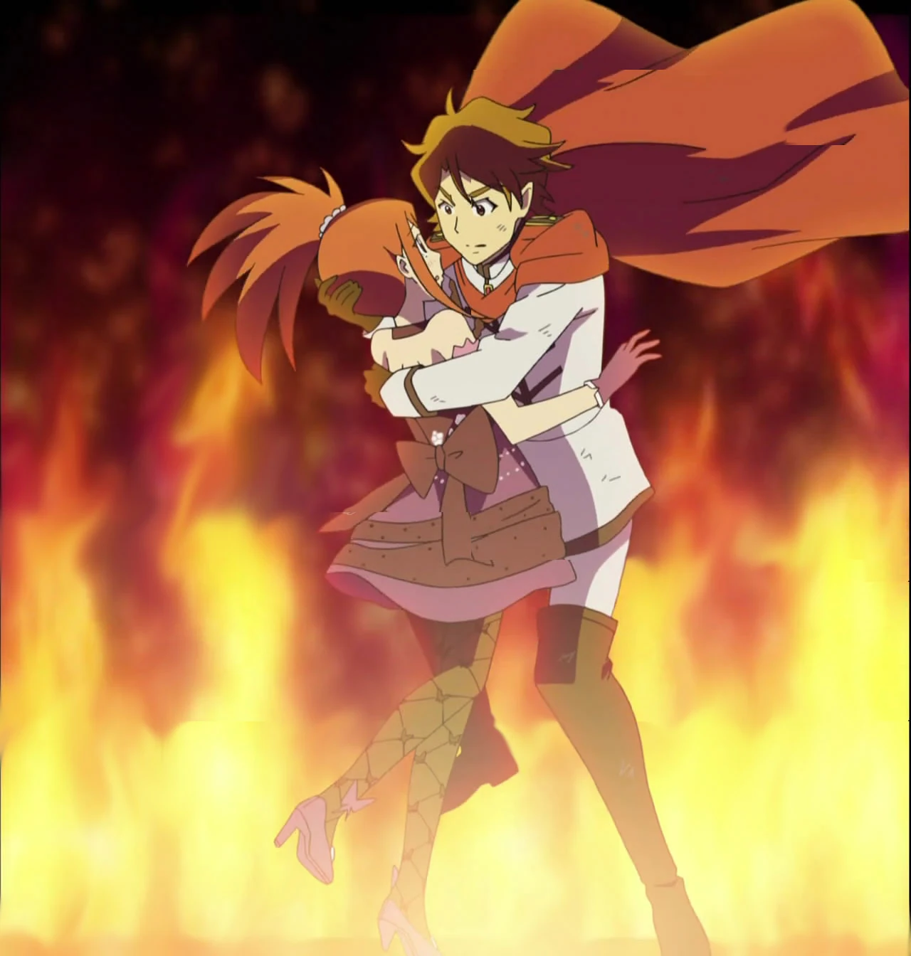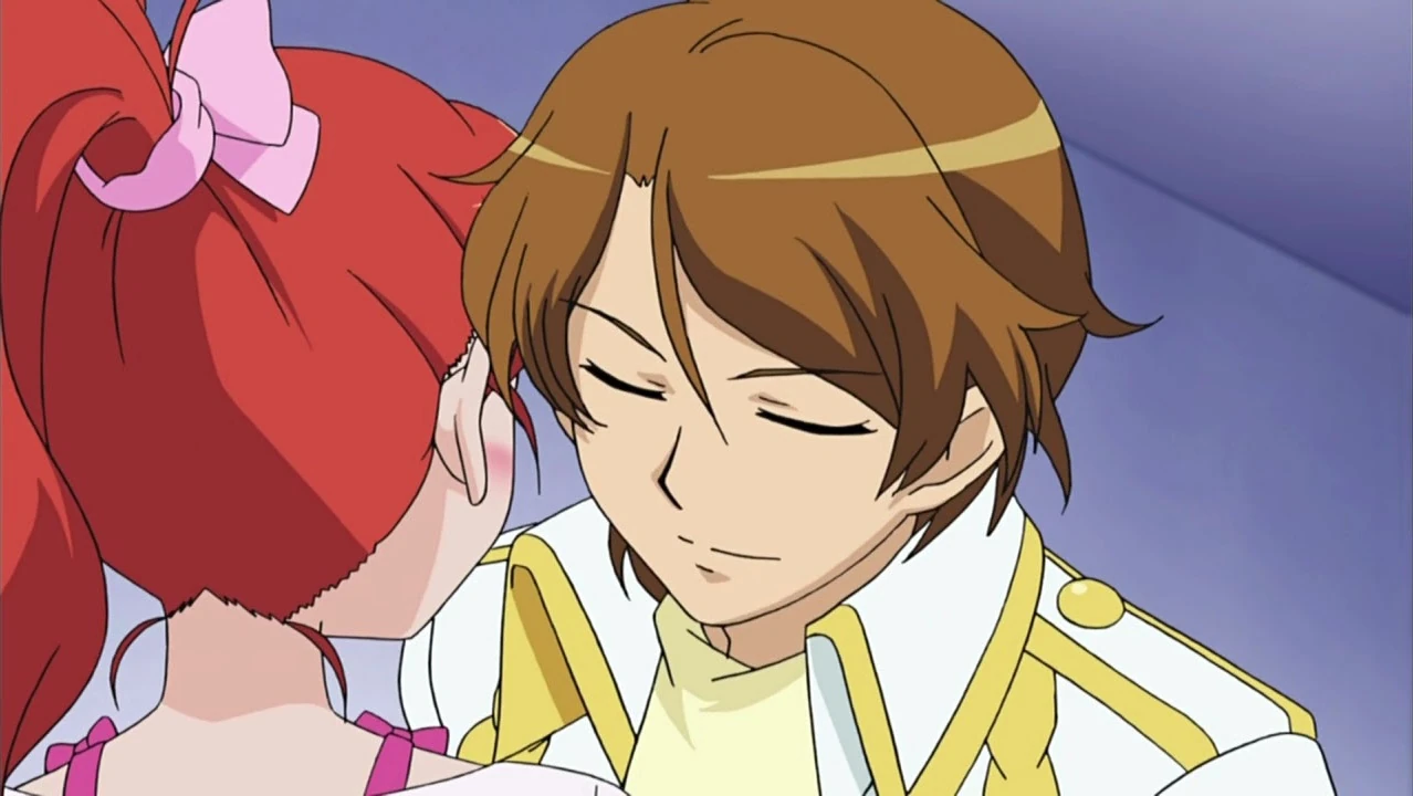 During the Road to Symphonia, Yunsu appears in a prince's attire to take her away. However, before he can, Shou appears on a horse in prince's attire as well to capture her heart. After Aira screamed for them to stop, her wings turned to black, and she fell into a pit filled with flames. Although Yunsu could not reach her hand using a vine as a lifeline, Shou dived in without one, and refused to let go of her hand. Although Aira restated his principles of love being best when there was distance, he refused this, embraced her, and admited that sometimes they would fight, and she might run away from him sometimes, but every time she did, he would embrace her and love her. After confessing their feelings for each other and sharing a kiss, they perform the Mugen Hug Eternal jump, a Prism Jump only for the two of them and their love.